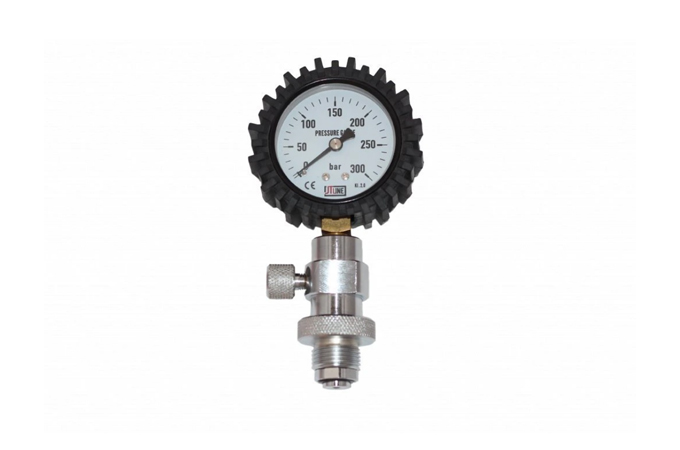 Kontrolní manometr HP / DIN 200 bar - odpouštění šroubkem. Manometr v provedení černý plech + gumový kryt. Manometr pro zjištění tlaku v lahvi.