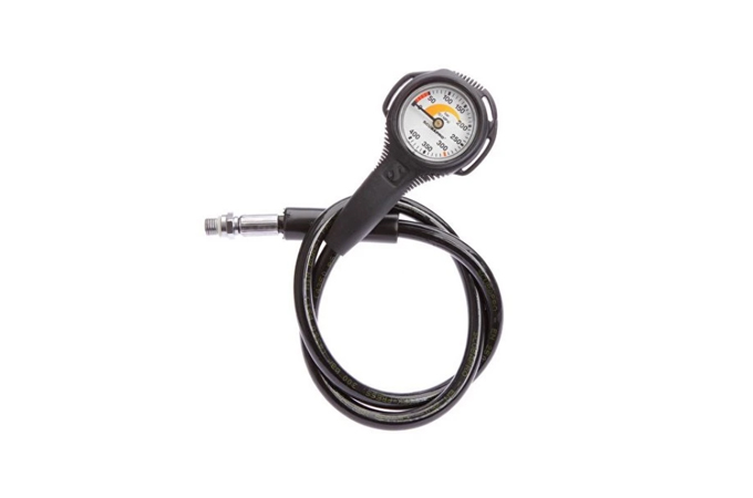 Tlakový manometr Scubapro do 400 bar v ochranné pryžové kapsli s vysokotlakou hadicí a ochranným zesilovačem. Výrobce Scubapro.