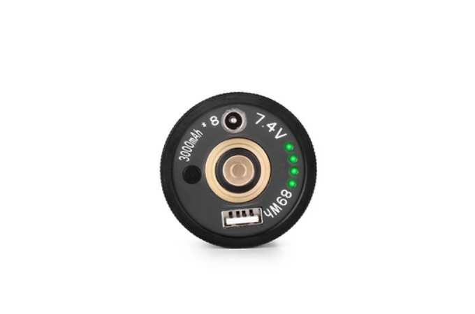 - Indikátor nabíjení ukazuje aktuální stav baterie (zelená nad 30%, červená 10-30%, blikající červená pod 10%)