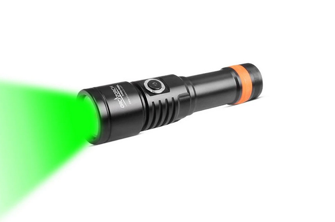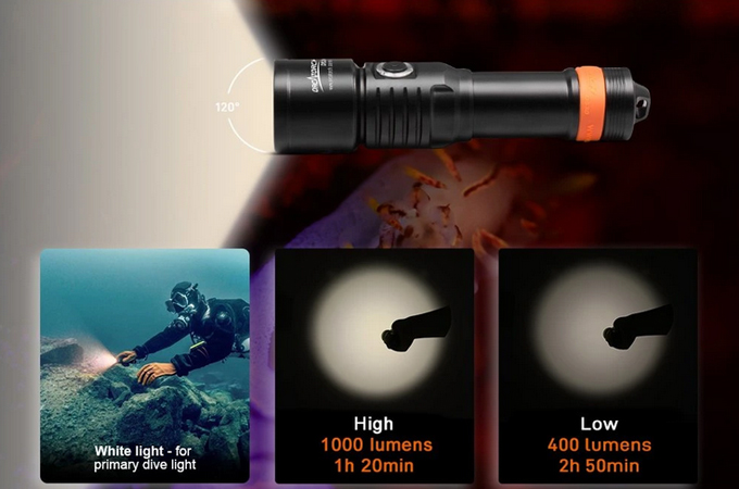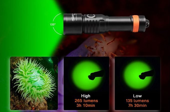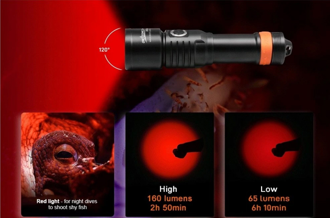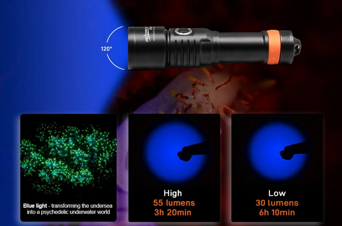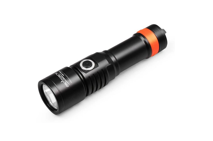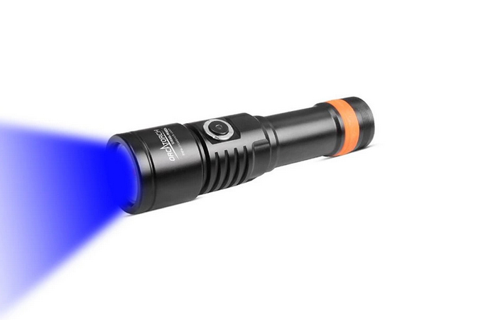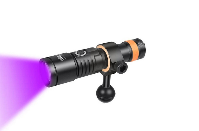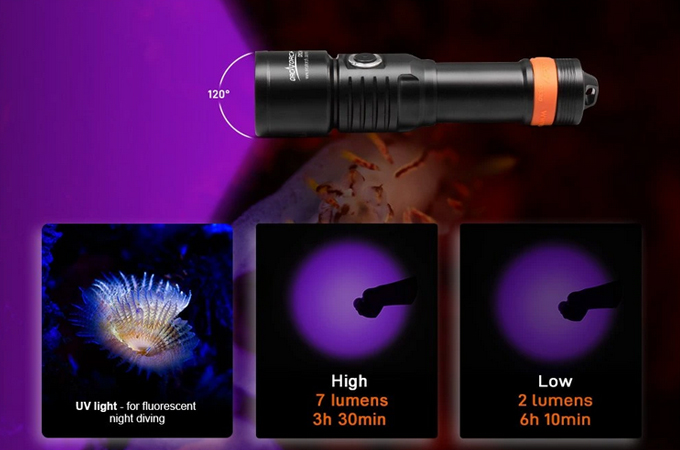 OrcaTorch D530V je profesionální potápěčské video světlo s UV paprskem, s max výstupem 160 lumenů. Má 120 ° super širokoúhlý světlomet bez slepého úhlu pro fotografování pod vodou. Světlo má boční spínač ze slitiny titanu, který nabízí 2 režimy osvětlení, což umožňuje snadné ovládání pod vodou. Kontrolka LED umístěná na tlačítku přepínače také informuje o zbývající baterii.