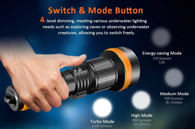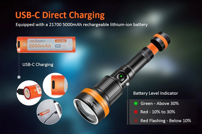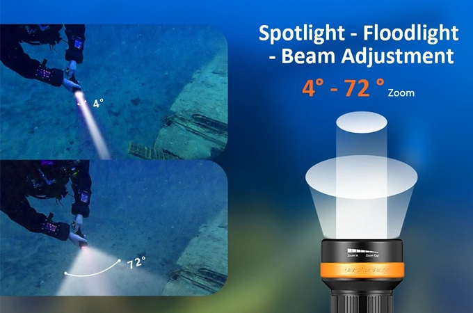 Jeho nastavitelný úhel paprsku (4° až 72°) poskytuje flexibilitu pro různé potřeby potápěče, ať už při průzkumu jeskyní, pozorování mořského života, podvodní fotografii atd. ZD710 MK2 je vybaven 5000mAh 21700 baterií s nabíjením přes USB-C pro pohodlné dobíjení. Disponuje bezpečnostní funkcí zámku, která brání náhodnému zapnutí, což z něj činí ideální potápěčské světlo pro hloubky až 150 metrů, schopné adaptace v různých podvodních prostředích.